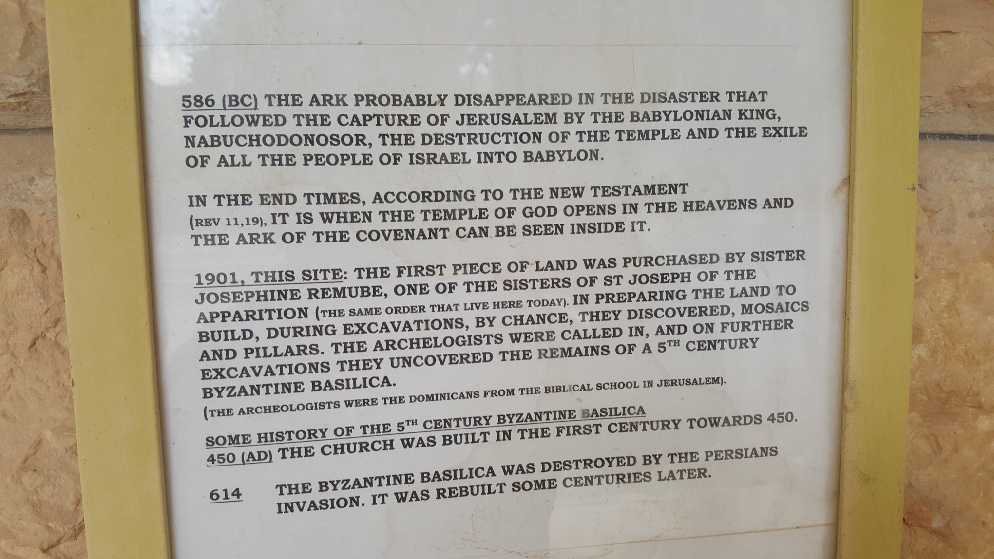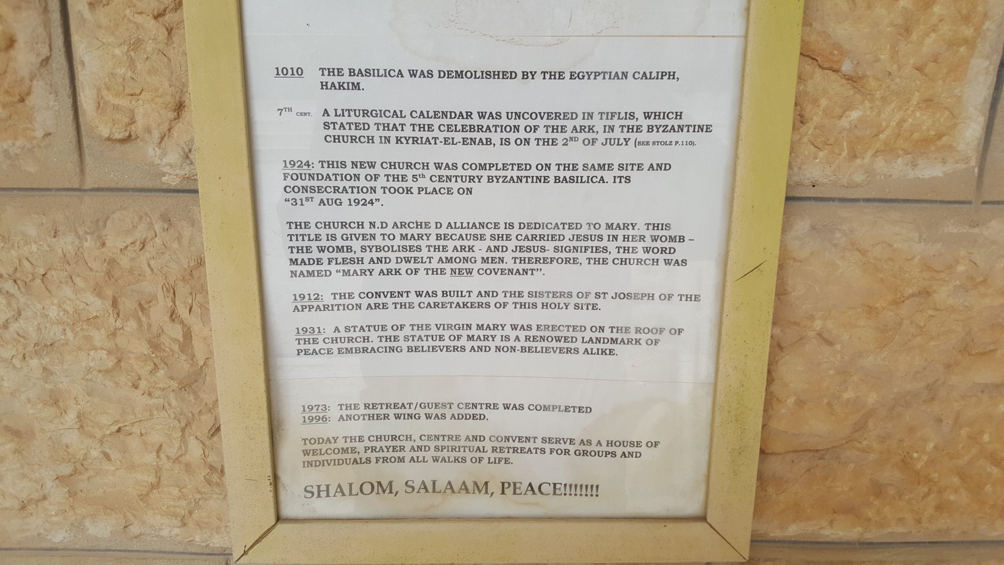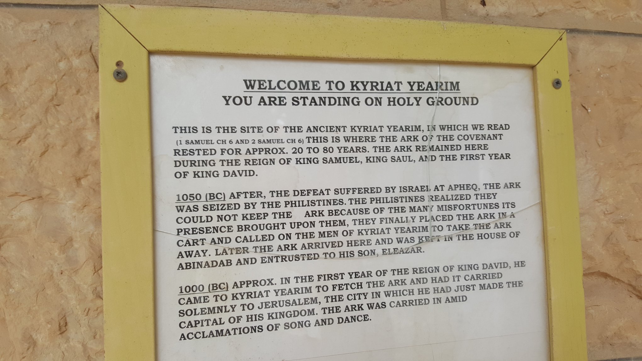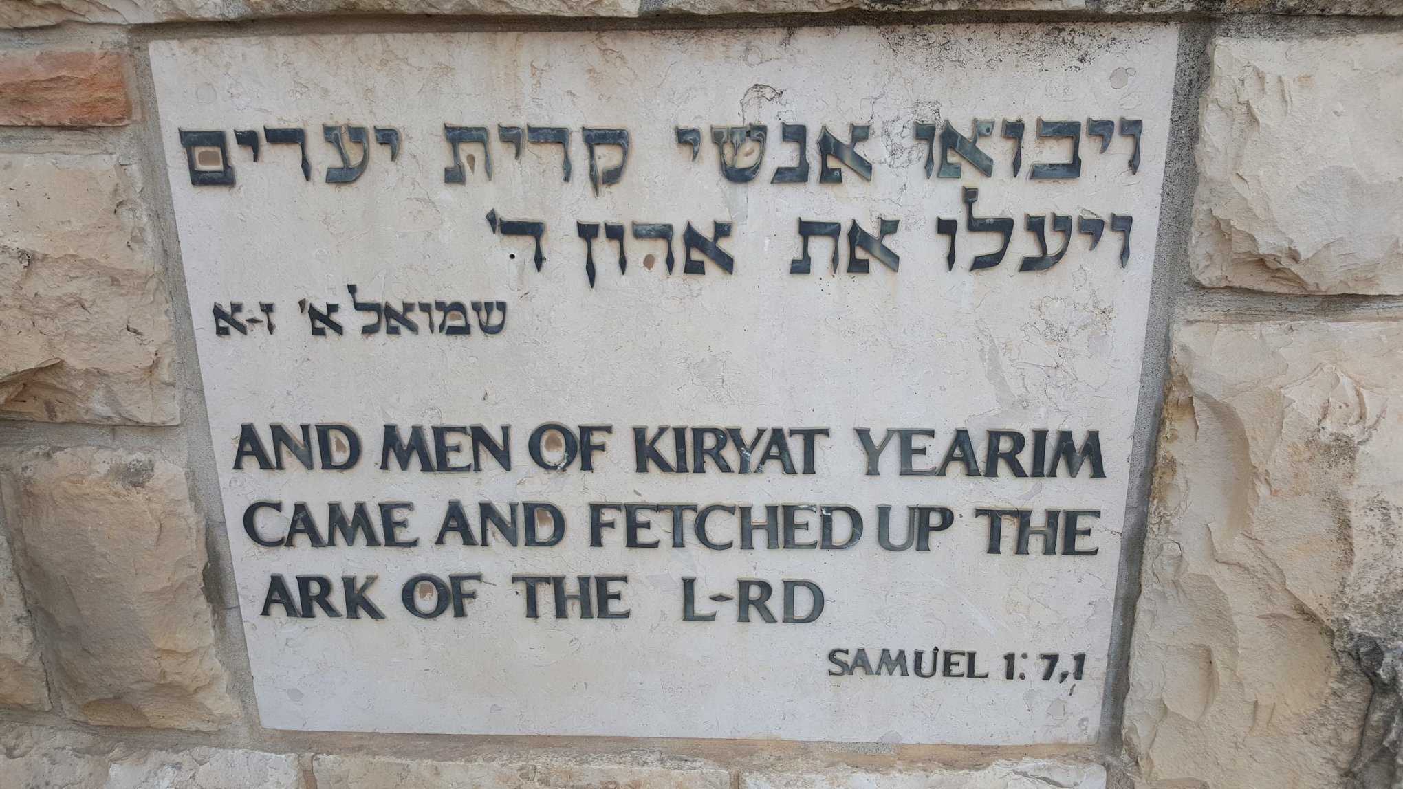 “On the hill” at Kiryat Yearim, at the top of Abu’Gosh (Emmaus) Village, where the Church of Notre Dame sits is mentioned in the Bible (1 Samuel 4:22) as to where the Philistines returned the Holy Ark of the Covenant to Israel at the house of Avinadav and his son Eliezer.